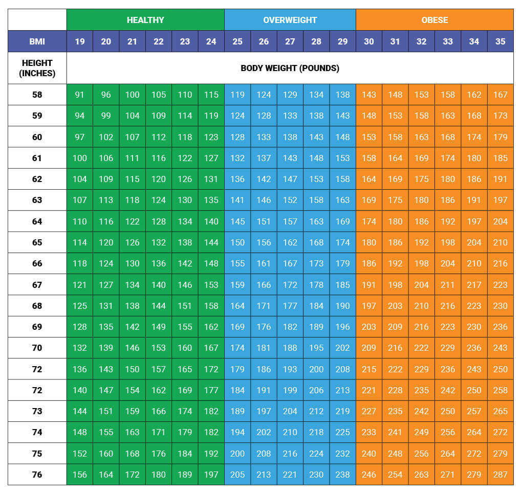 To estimate your BMI, match your height in inches to weight in pounds in the following table from the National Institutes of Health (NIH) National Heart, Lung, and Blood Institute (NHLBI):