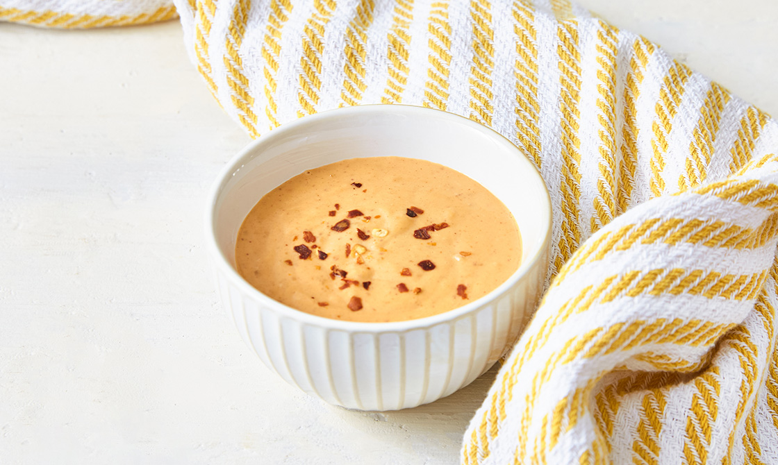 - In a medium bowl, combine the peanut butter, chili garlic sauce, tamari, lime juice, vinegar, and warm water. Whisk until well combined, thinning it with a little water if it’s thicker than you’d like. Sprinkle with red chili flakes and serve.
