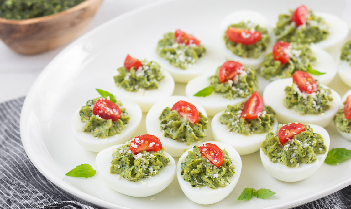 Did you know that the deviled eggs can be traced back to ancient Rome? Boiled eggs were seasoned with spicy sauces and served as the starter of a fancy meal usually made for guests. This version takes an herby spin on this old-fashioned favorite. These crowd-pleasers can be served as hors d’oeuvres or as part of a light lunch. This recipe results in extra pesto; to store for future use, top it with 1/2 inch of olive oil followed by a piece of plastic wrap directly on the surface, then refrigerate to keep fresh for up to 4 days (or freeze for 2 months). It’s delicious over eggs, zoodles, or roasted cauliflower.